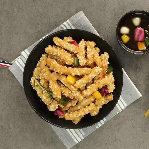 -. 예열된 기름에 냉동 상태의 찹쌀 탕수육을 넣어 3분 30초~4분간 노릇노릇하게 조리해 주세요.