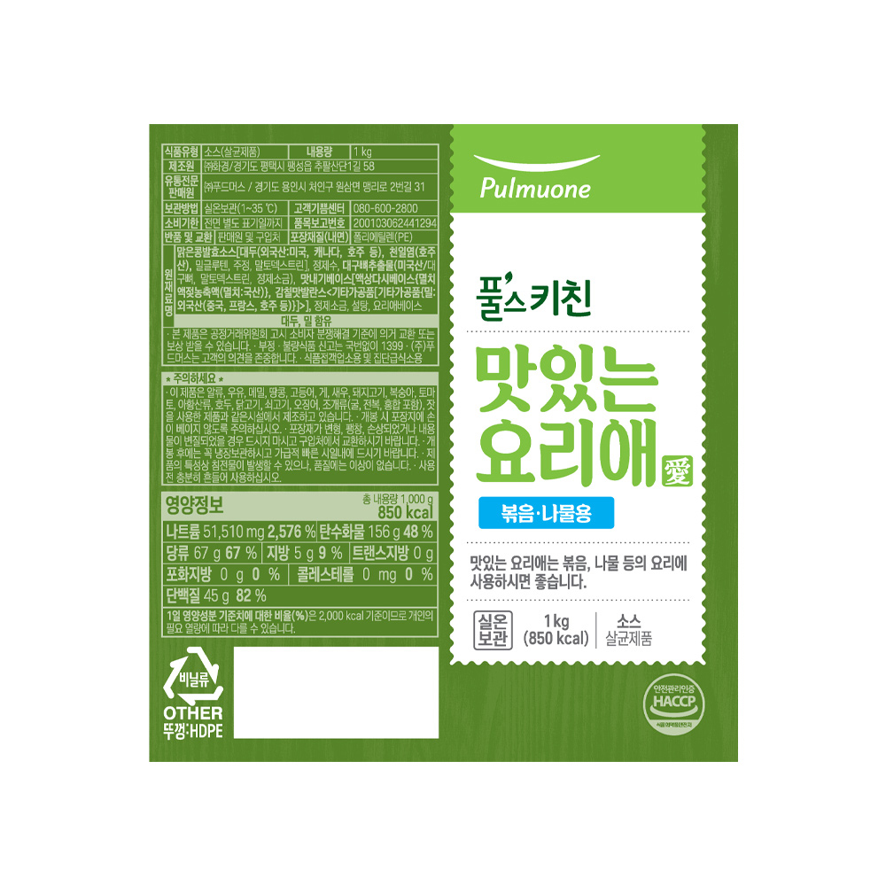 맑은콩발효소스[대두(외국산: 미국, 캐나다, 호주 등), 천일염(호주산), 밀글루텐, 주정, 말토덱스트린], 정제수, 대구뼈추출물(미국산/대구뼈, 말토덱스트린, 정제소금), 맛내기베이스[액상다시베이스{멸치액젖농축액(멸치: 국산)}, 감칠맛발란스<기타가공품[기타가공품{밀: 외국산(중국, 프랑스, 호주 등)}]>], 정제소금, 설탕, 요리애베이스