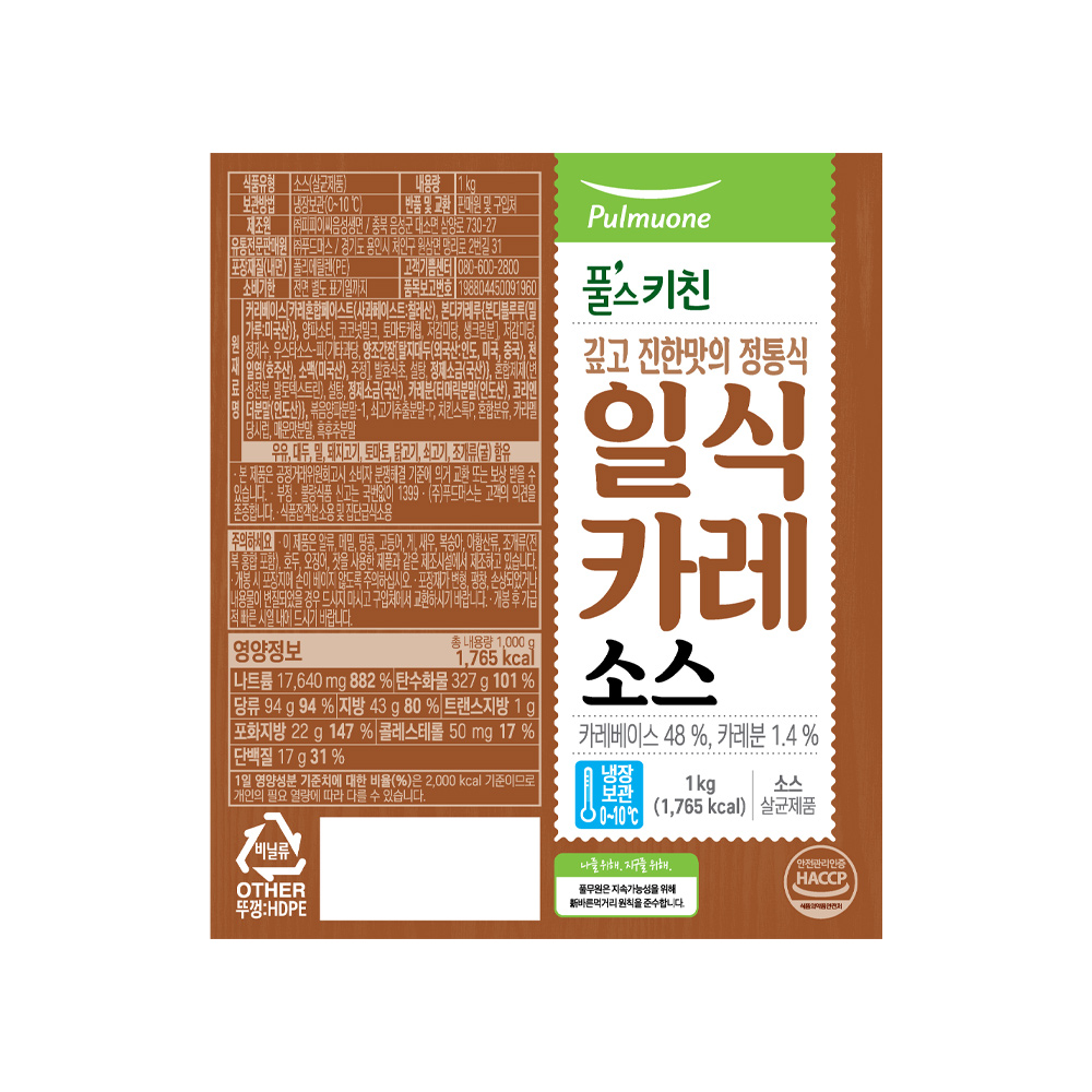커리베이스[카레혼합페이스트(사과페이스트: 칠레산), 본디카레루{본디블루루(밀가루: 미국산)}, 양파소티, 코코넛밀크, 토마토케첩, 저감미당, 생크림분], 저감미당, 정제수, 우스타소스-피{기타과장, 양조간장[탈지대두(외국산: 인도, 미국, 중국), 천일염(호주산), 소맥(미국산), 주정], 발효식초, 설탕, 정제소금(국산)}, 혼합제제(변성전분, 말토덱스트린), 설탕, 정제소금(국산), 카레분{터머릭분말(인도산), 코리엔더분말(인도산)}, 볶음양파분말-1, 쇠고기추출분말-P, 치킨스톡P, 혼합분유, 카라벨당시럽, 매운맛분말, 흑후추분말